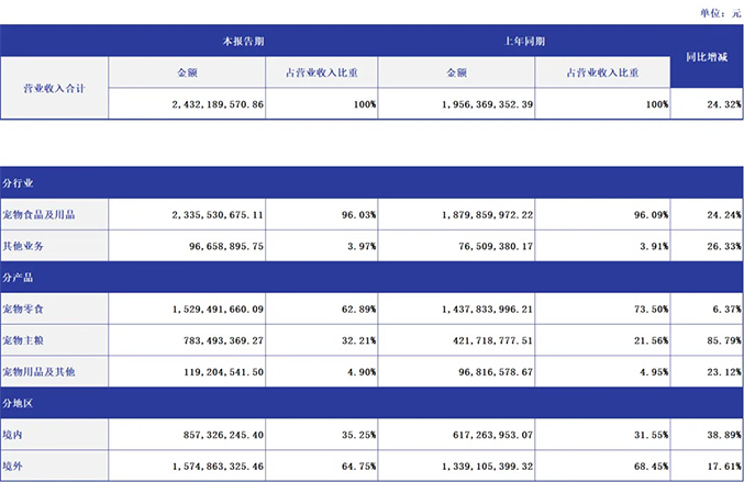 在“以自主品牌建设为核心,聚焦国内市场,加速海外市场拓展”的战略指引下,境内外业务呈现协同发展的良好态势。上半年,yl7703永利境内主营业务收入8.57亿元,同比增长38.89%。境外主营业务收入15.75亿元,同比增长17.61%。从业务结构来看,宠物主粮业务贡献销售额为7.83亿元,同比增长85.79%,宠物零食作为公司的传统优势业务,上半年实现收入15.29亿元,同比增长6.37%。